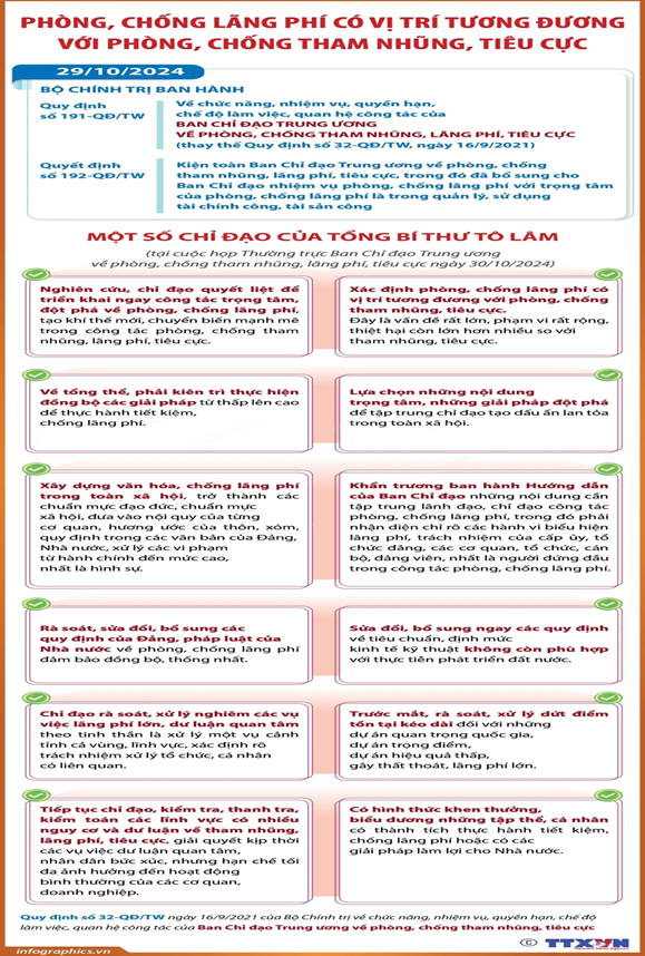 Cuộc đấu tranh chống lãng phí là một nhiệm vụ trọng tâm của công tác xây dựng Đảng, là nhiệm vụ trực tiếp, thường xuyên của cả hệ thống chính trị và toàn xã hội. Trong cuộc chiến với thứ “giặc nội xâm” đầy cam go, phức tạp này, cần nâng cao ý thức, trách nhiệm trong cán bộ, đảng viên và người lao động, trước hết là sự nêu gương của người đứng đầu tại từng cơ quan, tổ chức, cá nhân khu vực công, khu vực tư để từ đó “tạo sự lan tỏa mạnh mẽ, trở thành tự nguyện, tự giác của mỗi cán bộ, đảng viên và người dân, văn hóa ứng xử trong thời đại mới” như Tổng bí thư Tô Lâm đã kêu gọi./.