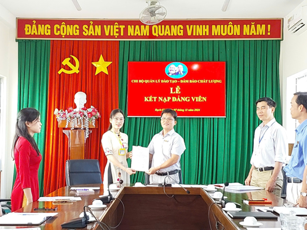 Thực hiện Quyết định số 4790-QĐ/ĐUK và Quyết định số 4791-QĐ/ĐUK ngày 28/10/2024 của Ban Thường vụ Đảng ủy khối các Cơ quan – Doanh nghiệp tỉnh, được sự nhất trí của Đảng ủy Trường CĐSP Kiên Giang, ngày 07 tháng 11 năm 2024, Chi bộ Quản lý đào tạo – Quản lý chất lượng tiến hành tổ chức Lễ kết nạp Đảng viên cho 02 quần chúng Bùi Thị Thu Hoài và Thị Mỹ Trinh. Tại buổi lễ, đồng chí Phan Đầu, Bí thư Chi bộ đã đọc và trao Quyết định kết nạp Đảng cho 02 quần chúng.